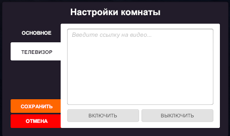 Далее Вам нужно открыть комнату для всех, друзей либо только для группы чтобы появилась кнопка настройки комнаты. В окне настроек комнаты Вы найдите пункт меню «Телевизор» и вставьте в текстовое поле прямую ссылку на видео-файл либо ссылку с облачного сервиса. Затем нажмине на кнопку «Включить». Слева снизу активируется интерфейс управления плеером.